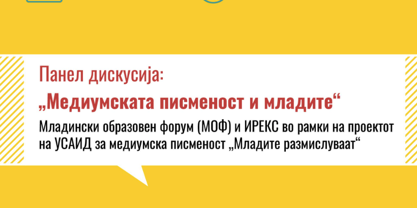 Денес во рамки на Деновите на медиумска писменост 2024, во период од 13:00 до 15:30 часот, во Собранието на Република Северна Македонија ќе се одржи панел дискусија на тема „Медиумската писменост и младите“, организирана од Младинскиот образовен форум (МОФ) и ИРЕКС.