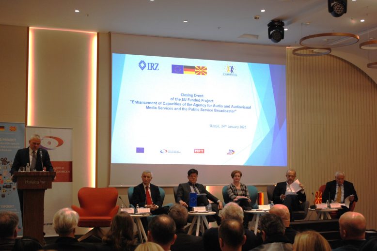 Скопје, 27.01.2025 – На 24 јануари, Агенцијата за аудио и аудиовизуелни медиумски услуги и Германската Фондација за меѓународна соработка (IRZ), одржаа заеднички настан со кој се заокружи Твининг проектот „Зајакнување на капацитетите на Агенцијата за аудио и аудиовизуелни медиумски услуги и на Јавниот радиодифузен сервис“, финансиран од Европската Унија. Настанот го отвори проектниот лидер Холгер Албрих…
